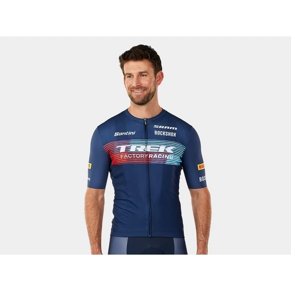 Official team apparel made by Santini with the Trek Factory Racing team logo proudly displayed.